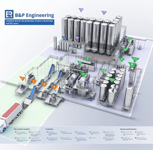 Complete technological lines for the production of NFC juices, juice concentrates and fruit purees